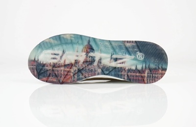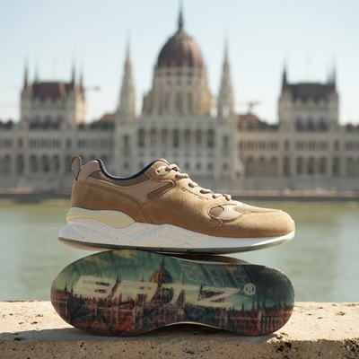 A barna, bézs és sötétkék harmonikus kombinációja a város karakterét idézi, míg az átlátszó talpban az Országház tükröződik – Budapest egyik ikonikus csodája szó szerint a talpad alatt.