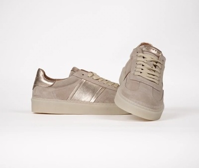 A bézs színű Delila sneaker egy letisztult, kényelmes darab. Hasított bőr felsőrészét csillogó részletekkel láttuk el, így könnyen kombinálható nőies és sportos összeállítással egyaránt. Könnyű és rugalmas kialakításának köszönhetően maximális kényelmet nyújt, miközben divatos megjelenést kölcsönöz. A cserélhető talpbetétnek köszönhetően akár saját egyedi stílusodnak megfelelően is alakíthatod a kényelmet – egyedi talpbetét választásával.