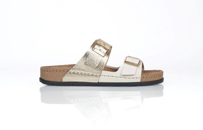 A két, állítható pánt és az aranyszínű csatok gondoskodnak a kényelmes, személyre szabott illeszkedésről. A könnyű, rugalmas, parafa hatású talp puha alátámasztást ad, így ideális választás a mindennapokra – akár városi sétához, akár otthoni pihenéshez.