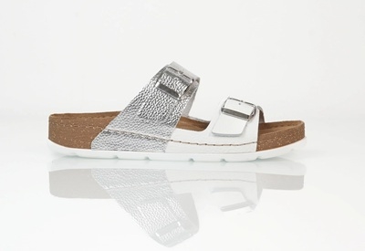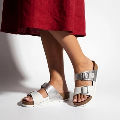 A két állítható pánt és az ezüstszínű csatok gondoskodnak a kényelmes, személyre szabott illeszkedésről. A könnyű, rugalmas, parafa hatású talp puha alátámasztást ad, így ideális választás a mindennapokra – akár városi sétához, akár otthoni pihenéshez.