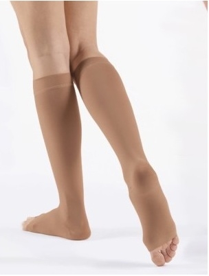 Könnyed (akár tavaszi, nyári) kompressziós térdzokni nyitott lábfejjel méz színben.