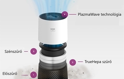 - 4 lépcsős levegőtisztítás: MESH előszűrő a porrészecskéknek, szénszűrő, 99.97%-os TrueHEPA szűrő és WINIX PlasmaWave® levegőtisztítási technológia