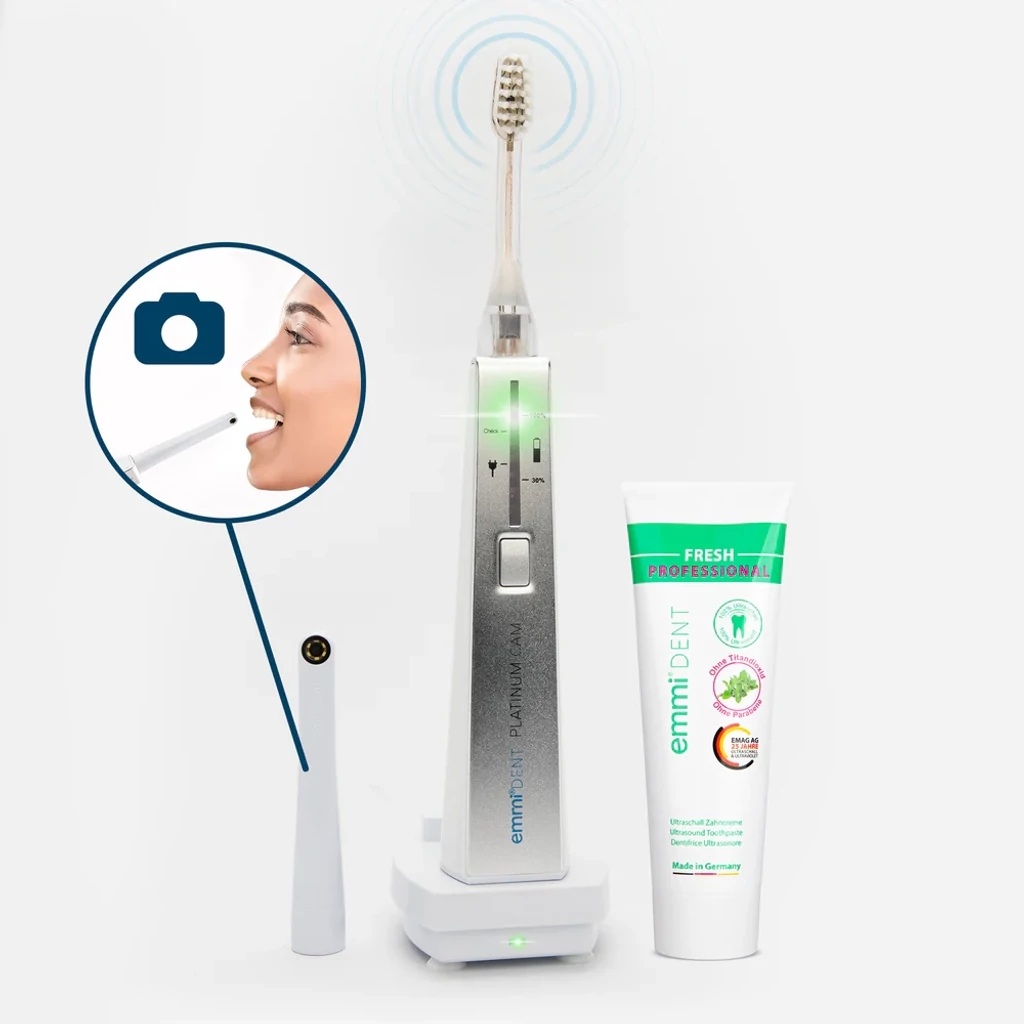 Az emmi-dent Platinum CAM a legújabb ultrahangos technológiát ötvözi egy integrált fogászati kamerával, hogy láthatóvá tegye a nehezen elérhető területeket a szájban – a még alaposabb tisztítás és ellenőrzés érdekében, kényelmesen az okostelefonon keresztül.